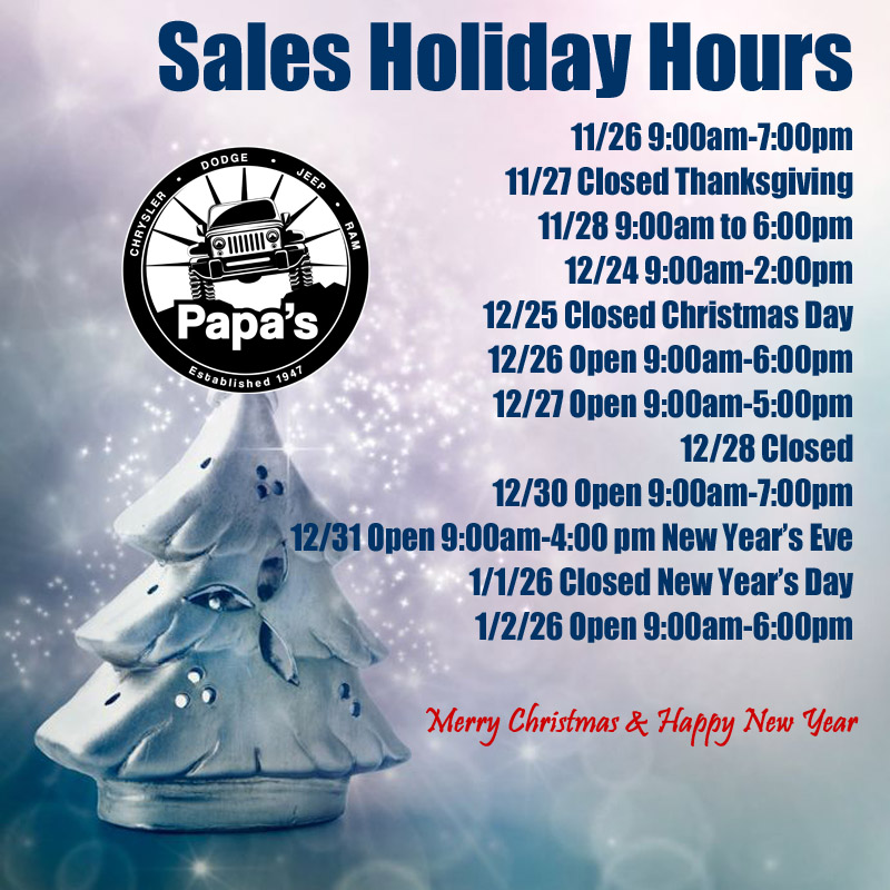 Papa’s New and Used Jeep RAM Dodge Chrysler Dealership of New Britain, CT. Papa’s has had Award Winning Customer Service since 1947. We Have Transparent Pricing Monthly Specials, and In Stock Jeep, RAM, Dodge, Chrysler Inventory. You Can Custom Factory Order Any Model or Come Down to Our Dealership and Test Drive Today. Papa’s Is Also A Trusted New Britain Used Car Dealership. Papa’s Has An Extensive Used Car Inventory, with Used Pre-Owned Car Truck and Suv Inventory Arriving Daily. Papa’s New and Used Jeep RAM Dodge Chrysler Dealership 585 East Main Street, New Britain, CT 06051. Or Call Our Sales Desk 860-356-0523 Or Certified Service Department 860-356-3840