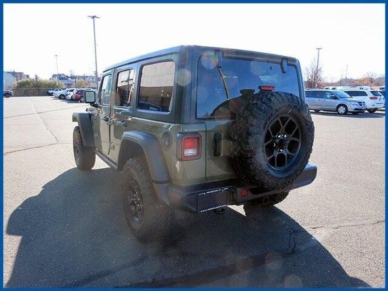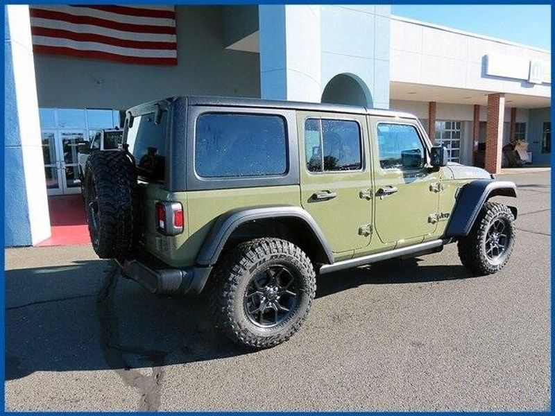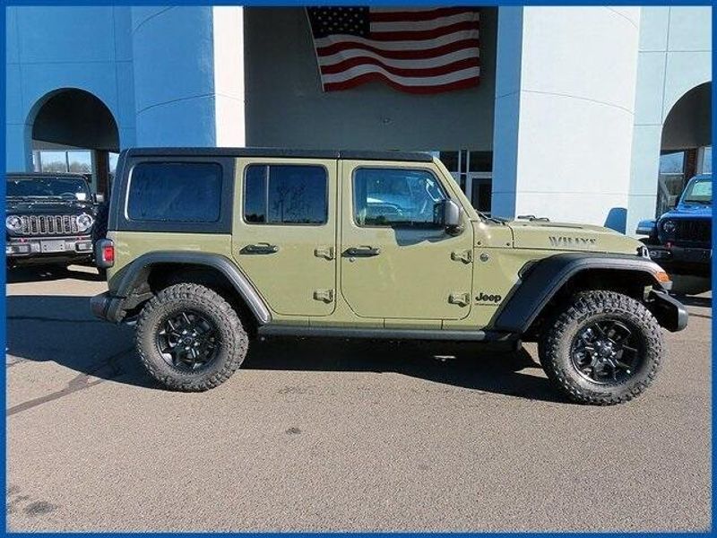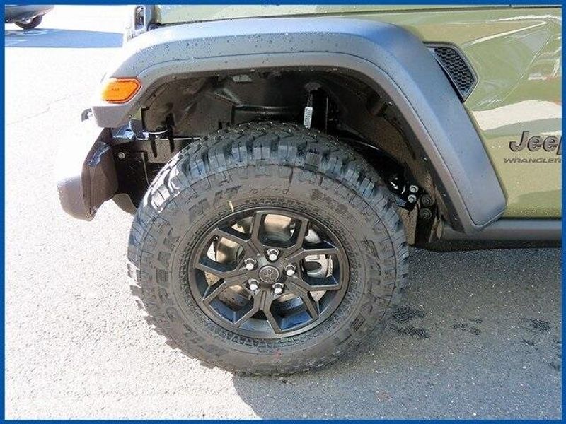 Wrangler Willys Willys 4 Door 4x4, 3.6L V6 24V VVT, 4WD, Black Cloth, 2-Door Passive Entry, Front Door Locks, 4-Wheel Drive Swing Gate Decal, 4.10 Rear Axle Ratio, 7 and 4 Pin Wiring Harness, 8 Speakers, Advanced Brake Assist, Air Conditioning with Auto Temp Control, Air Filtering, AM/FM radio: SiriusXM with 360L, Automatic Headlamps, Auxiliary Switches, Black Grille, Class II Receiver Hitch, Cluster 7.0'' TFT Color Display, Convenience Group, Conventional Differential Front Axle, Corning Gorilla Glass, Dana M210 Wide HD Tube Front Axle, Dana M220 Wide Rear Axle, Daytime Running Lamps LED Accents, Deep Tint Sunscreen Windows, E-Locker Rear Axle, Emergency/Assistance Call, Enhanced Adaptive Cruise Control, Front LED Fog Lamps, Full Speed Forward Collision Warning Plus, Heated Front Seats, Heated Steering Wheel, Injection Molded Black Rear Bumper, LED Premium Reflector Headlamps, Mold in Color Bumper with Gloss Black, Molded in Color Rubicon Highline Flare, MOPAR All-Weather Floor Mats, Off-Road Plus Mode, Power Heated Mirrors, Premium Wrapped Steering Wheel, Quick Order Package 24W Willys, Radio data system, Radio: Uconnect 5 with 12.3'' Display, Security Alarm, SiriusXM with 360L, Sun Visors with Illuminated Vanity Mirrors, Universal Garage Door Opener, Wheels: 17'' x 7.5'' Painted Black, Willy's Suspension, Willys Hood Decal.