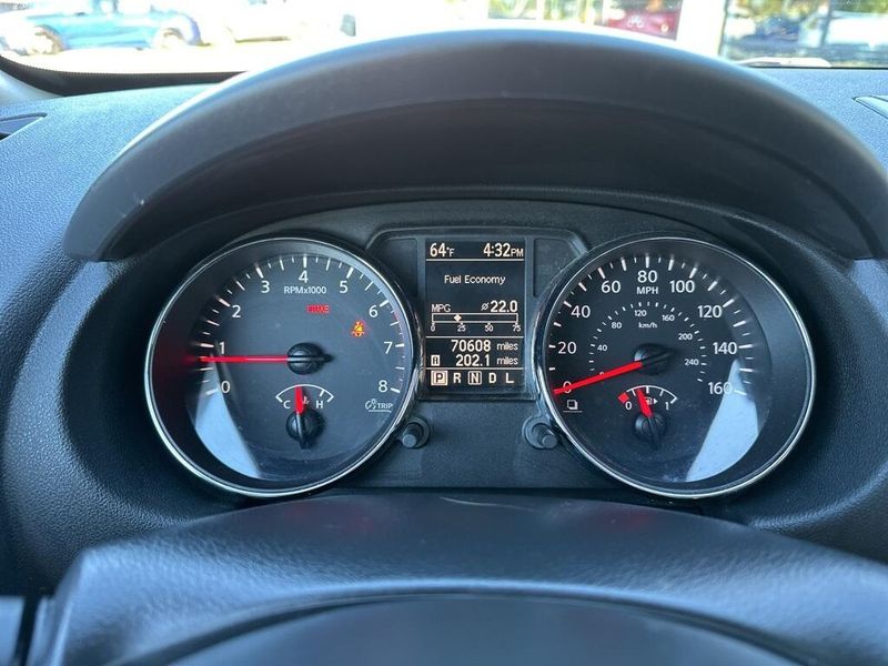 Under the hood, the Rogue S is powered by a 2.5-liter DOHC 16-valve I4 engine paired with Nissans continuously variable transmission (CVT) with sport mode, offering smooth acceleration and impressive fuel efficiency rated at 22 MPG in the city and 26 MPG on the highway. The intelligent all-wheel-drive system ensures confidence in various weather conditions, supported by independent strut front suspension and multi-link rear suspension for a comfortable and stable ride. The 4-wheel vented disc brakes with electronic brake-force distribution and brake assist provide enhanced stopping power, while the speed-sensitive power steering contributes to nimble handling.