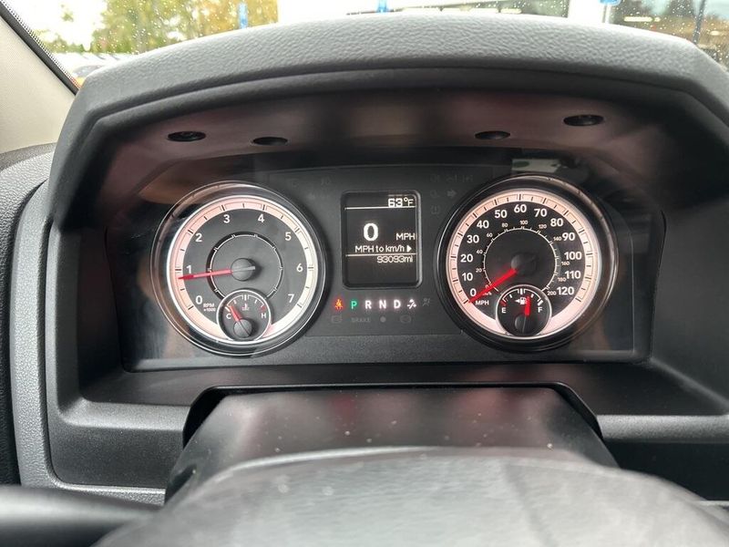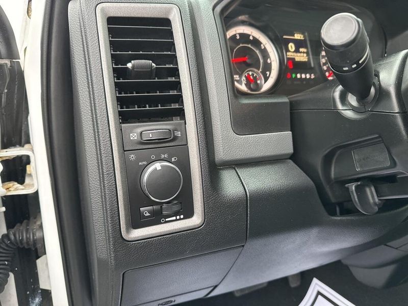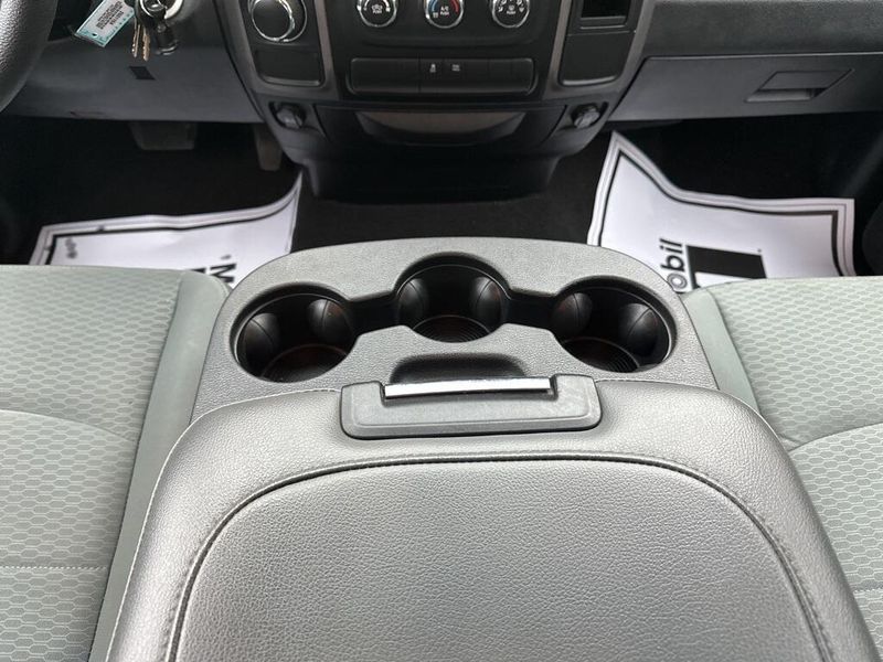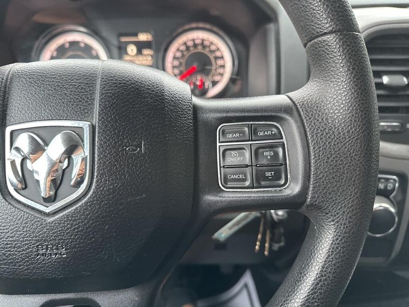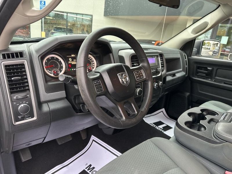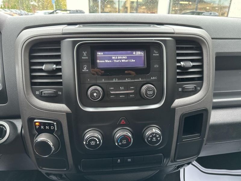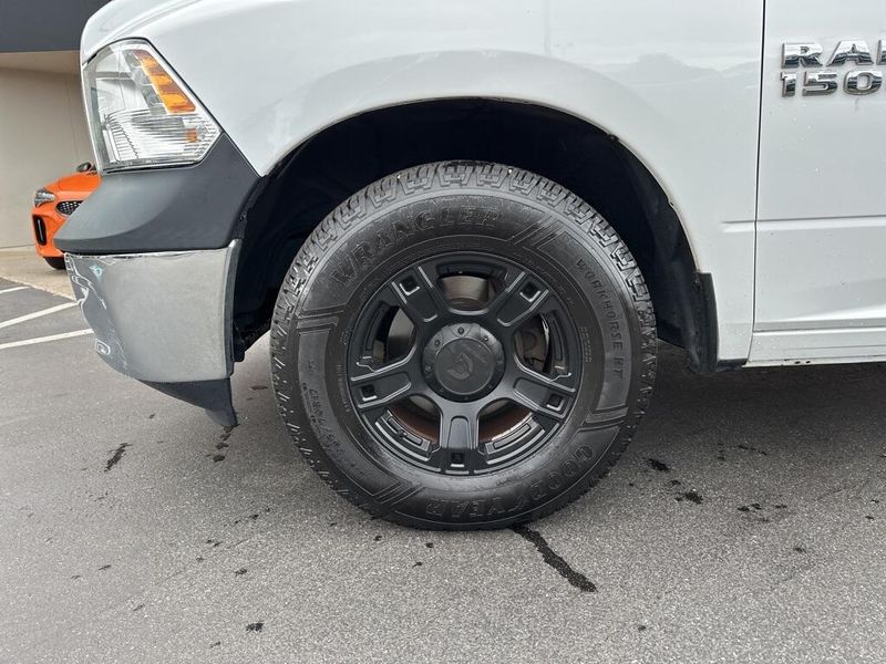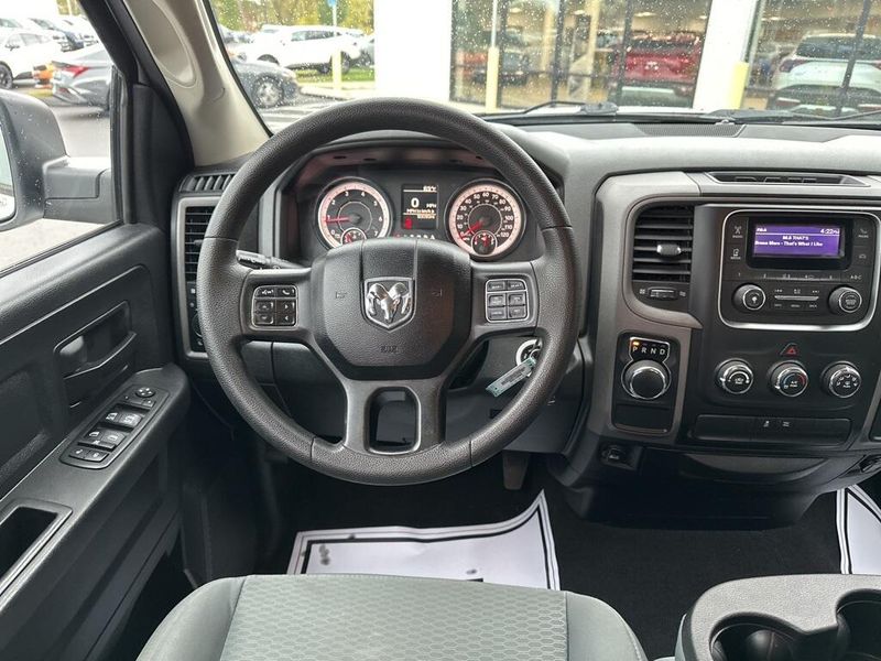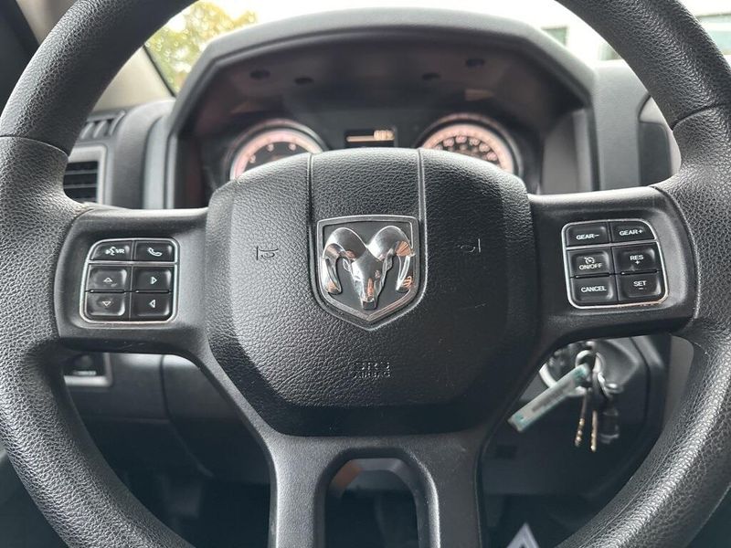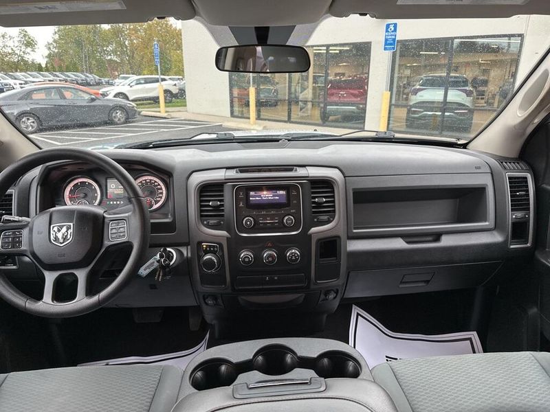 Under the hood, the 2017 Ram 1500 Tradesman is powered by a 3.6-liter V6 24-valve VVT engine paired with an efficient 8-speed automatic transmission. Features like the 3.21 rear axle ratio, trailer tow package with both 4-pin and 7-pin connectors, Class IV receiver hitch, and a 26-gallon fuel tank highlight its ability to handle towing and hauling tasks with confidence. Safety and stability are enhanced with electronic stability control, anti-lock 4-wheel disc brakes, and multiple supplemental airbags throughout the cabin.