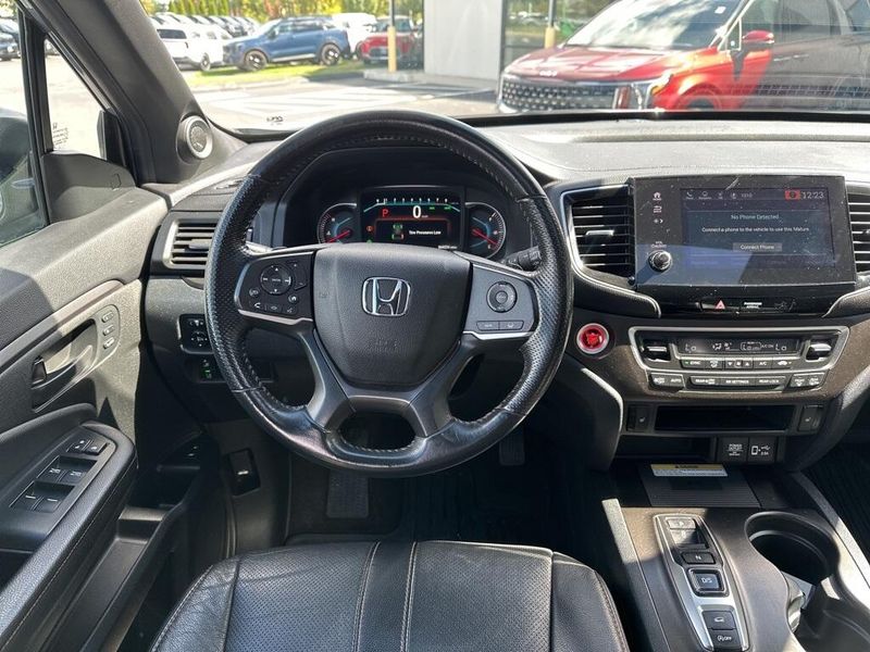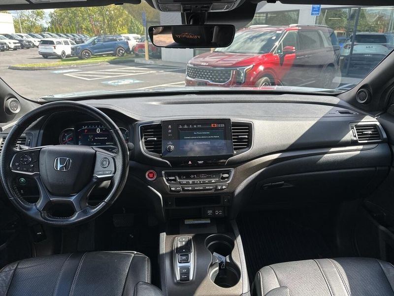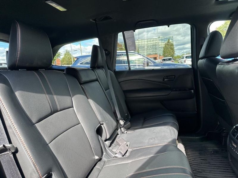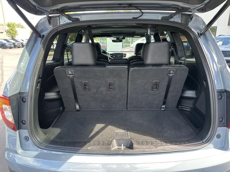 Inside, the 2022 Pilot TrailSport provides seating for up to eight passengers, blending comfort and practicality. Black leather-trimmed heated front bucket seats with driver memory and power lumbar support ensure comfort on longer drives. A versatile 60/40 split-folding second and third row with fold-into-floor functionality offers flexible cargo options. Interior highlights include a leather-wrapped steering wheel, tri-zone automatic climate control, conversation mirror, and multiple USB charging ports across all rows.