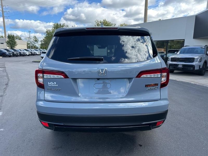 2022 Honda Pilot AWD TrailSport is a rugged yet refined SUV designed for drivers who want family-friendly versatility with adventurous capability. Finished in Sonic Gray Pearl with a black interior, this Pilot TrailSport edition enhances the SUVs commanding presence with exclusive gloss black 18-inch alloy wheels, rugged 245/60R18 all-season tires, and unique black cladding and fender flares that set it apart from other trims. Its bold styling and premium details give it a distinctive look ready for both urban streets and off-road trails.