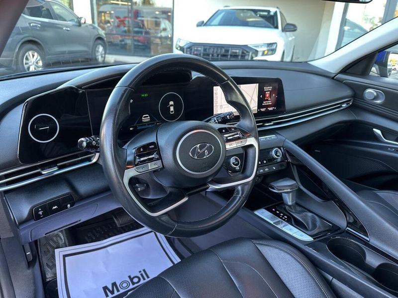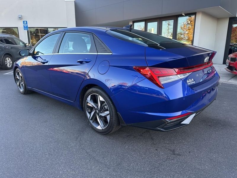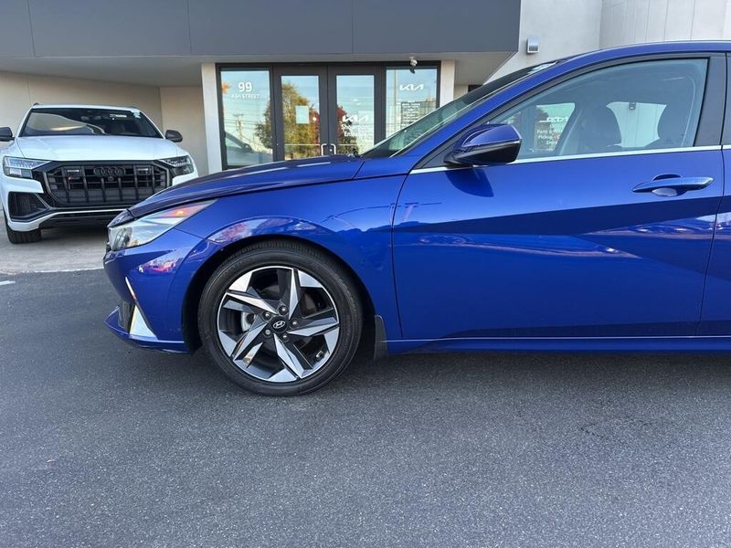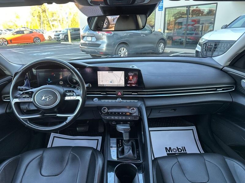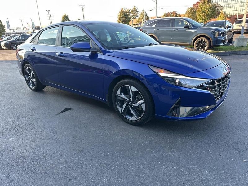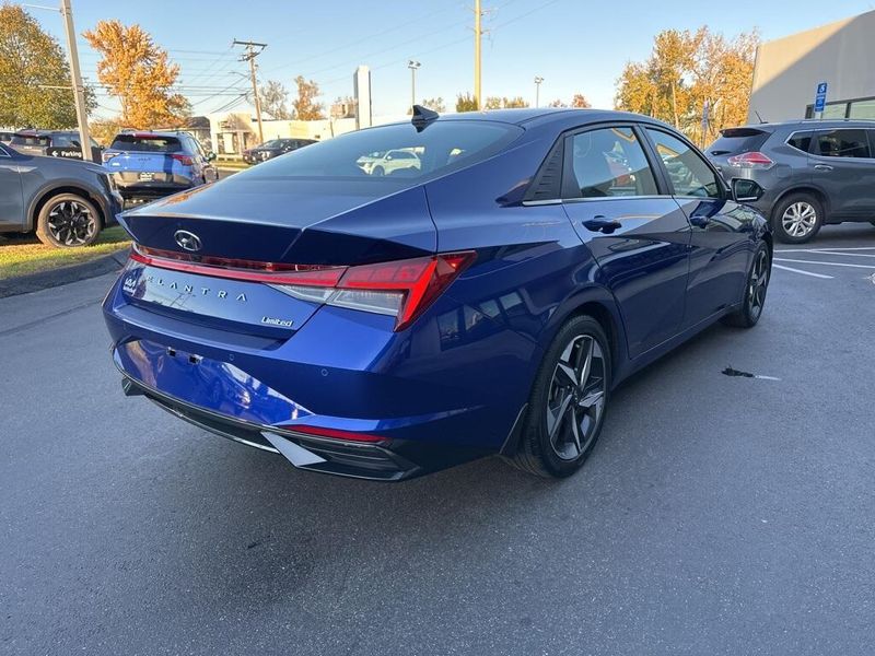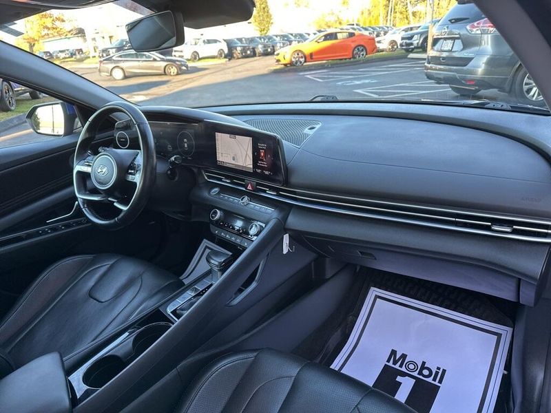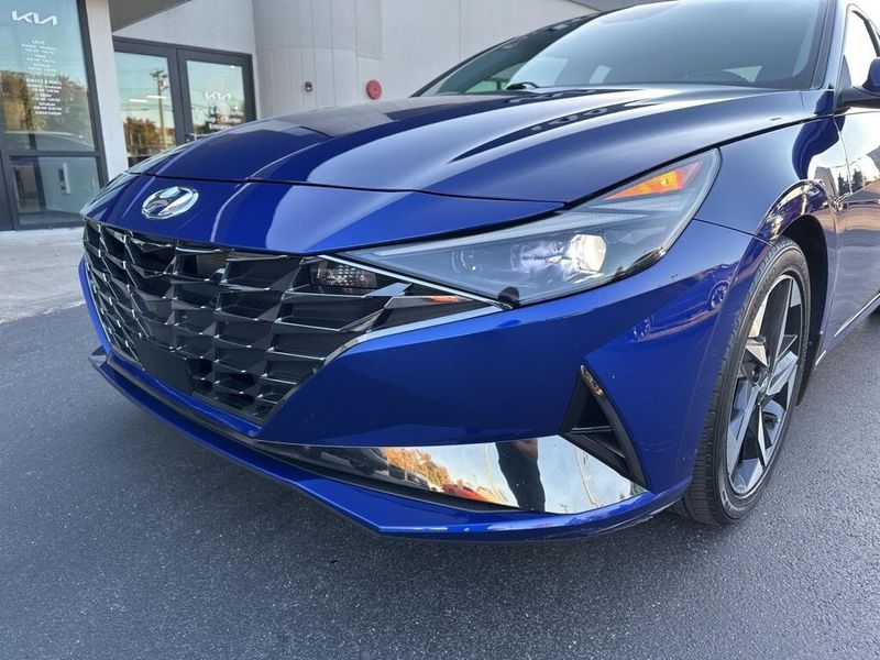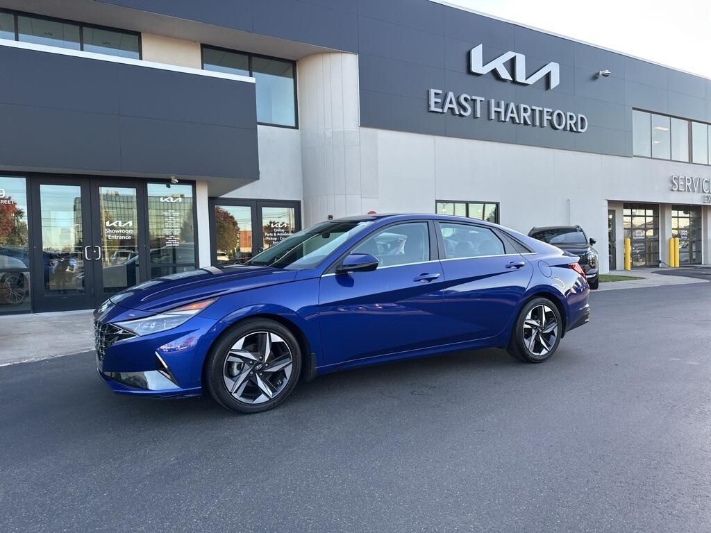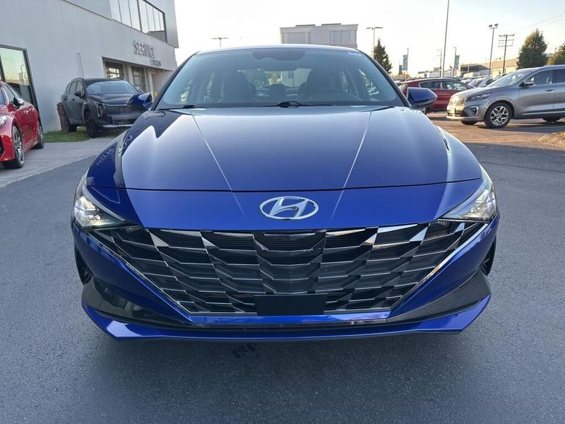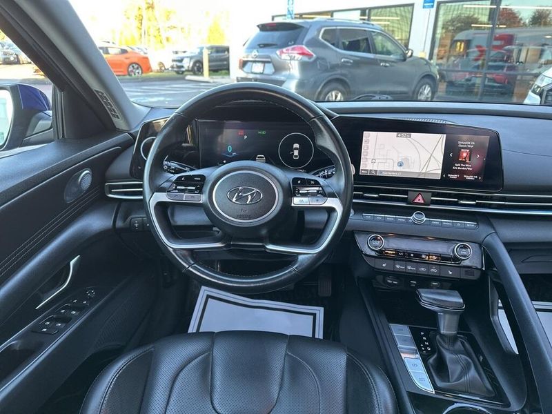 2022 Hyundai Elantra Limited embodies modern sophistication, advanced safety, and impressive efficiency in a stylish compact sedan built to exceed expectations. Finished in striking Intense Blue with a refined Black leather-trimmed interior, this one-owner vehicle combines contemporary design with premium amenities, making it a standout choice for drivers seeking both comfort and cutting-edge technology. With bold exterior lines, a distinctive grille, and 17-inch alloy wheels, the Elantra Limited showcases Hyundais dynamic design language while maintaining a sleek, aerodynamic silhouette.