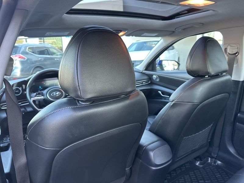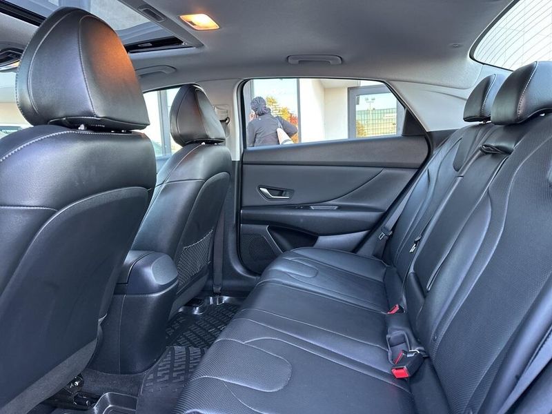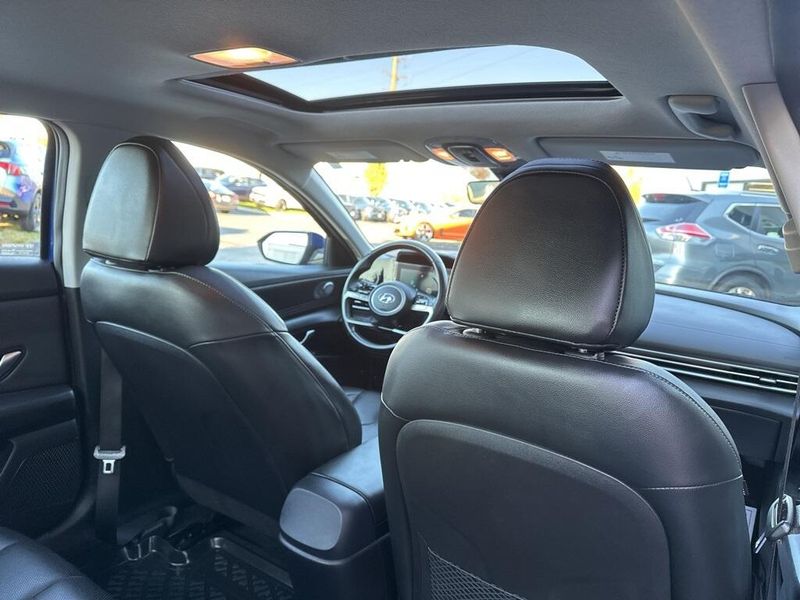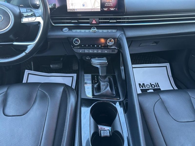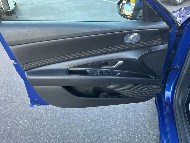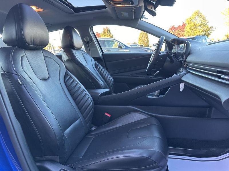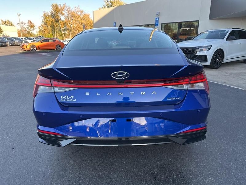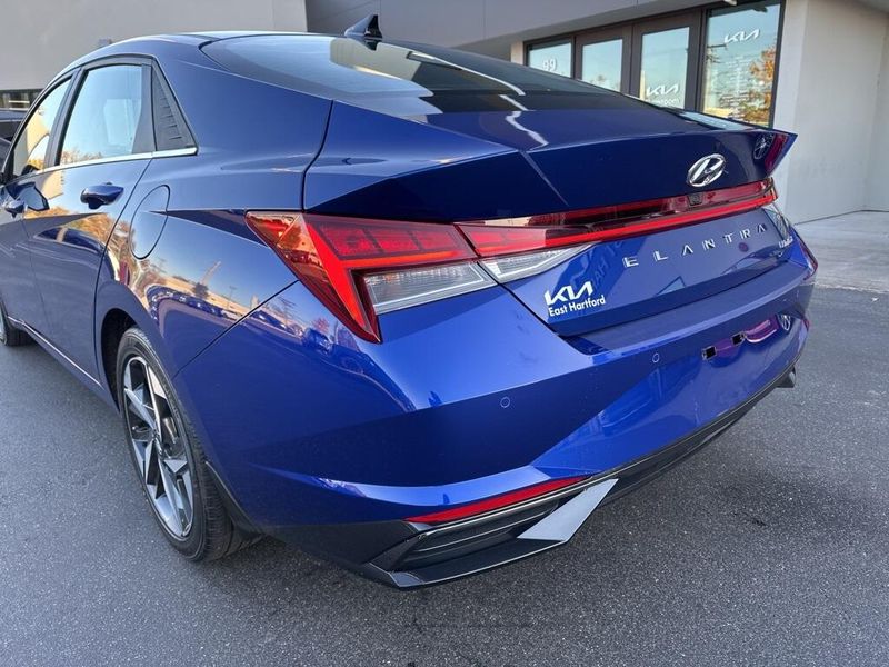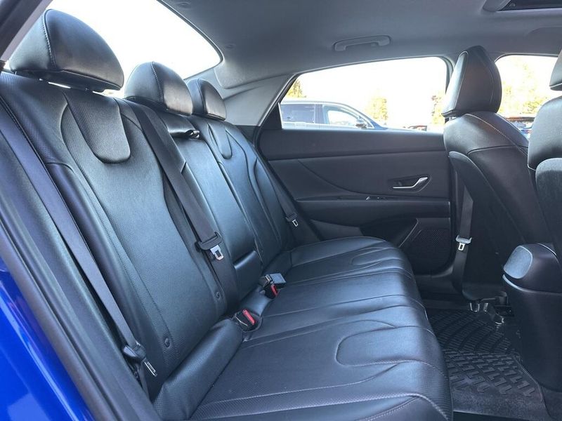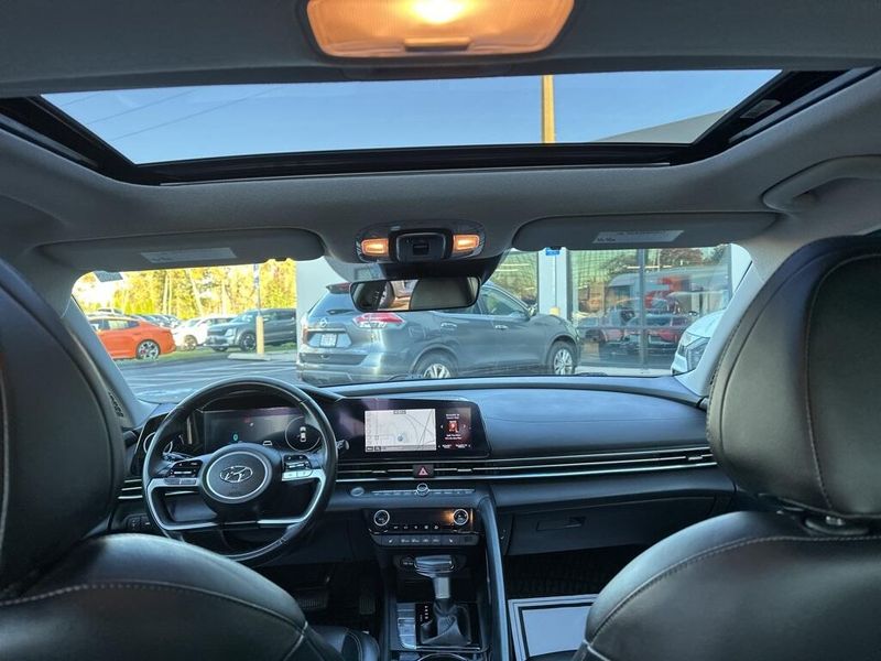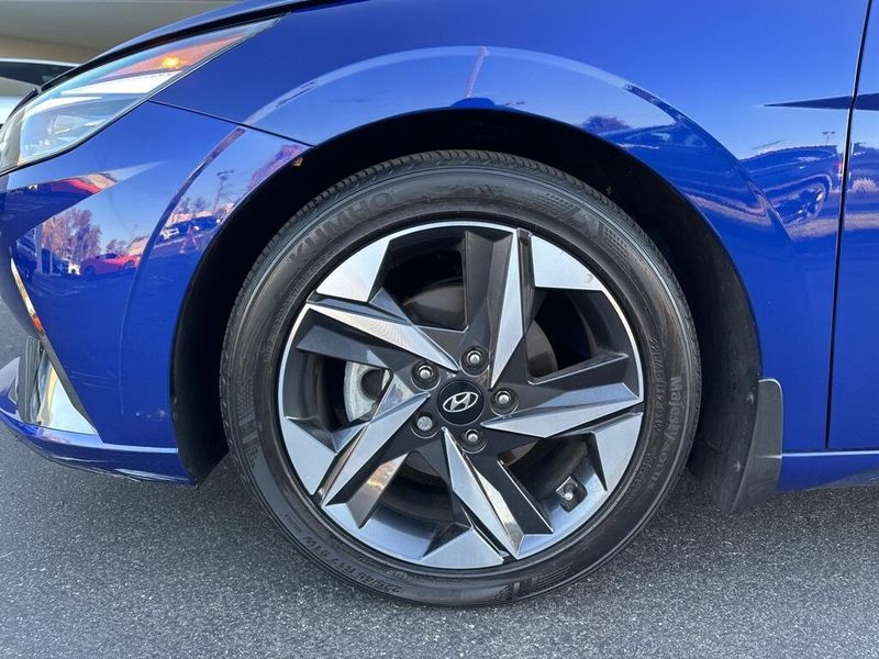2022 Hyundai Elantra Limited embodies modern sophistication, advanced safety, and impressive efficiency in a stylish compact sedan built to exceed expectations. Finished in striking Intense Blue with a refined Black leather-trimmed interior, this one-owner vehicle combines contemporary design with premium amenities, making it a standout choice for drivers seeking both comfort and cutting-edge technology. With bold exterior lines, a distinctive grille, and 17-inch alloy wheels, the Elantra Limited showcases Hyundais dynamic design language while maintaining a sleek, aerodynamic silhouette.