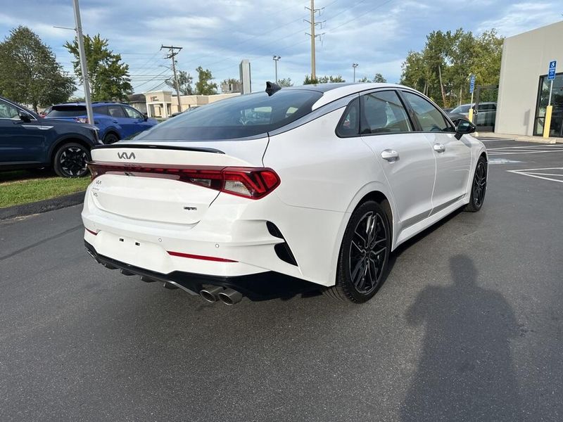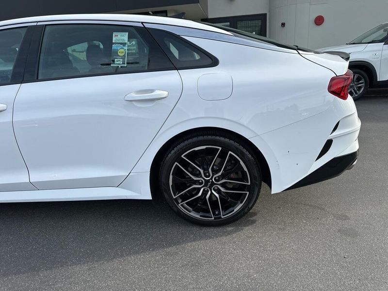 2023 Kia K5 GT FWD is a performance-focused midsize sedan that combines bold styling, advanced technology, and exhilarating power in a sleek package. Finished in Glacial White Pearl with a black interior, this GT trim commands attention on the road with its aggressive stance and refined details. As Kias sport-oriented K5 model, it offers a driving experience that blends luxury, comfort, and turbocharged performance.
