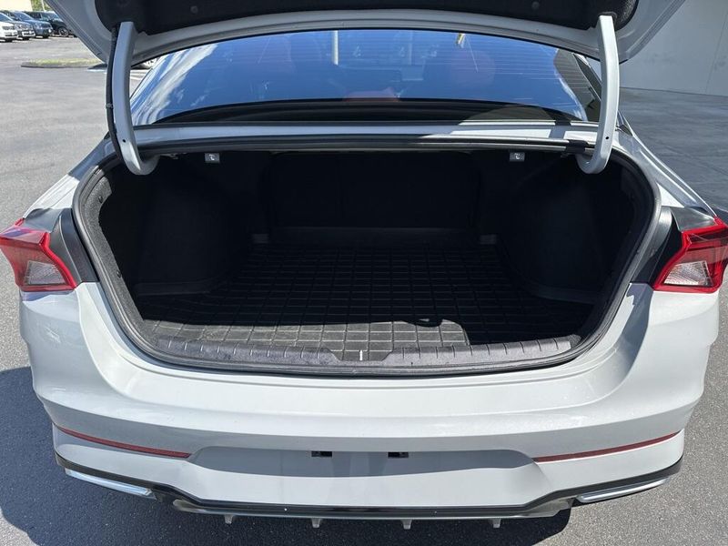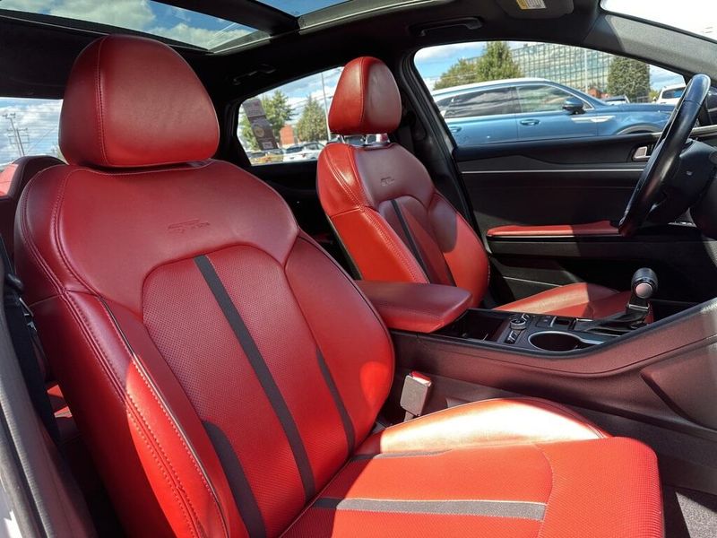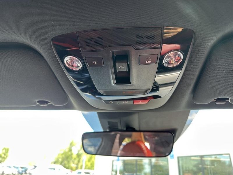 Inside, the cabin showcases a refined and sporty environment with heated front bucket seats, SynTex seat trim from the GT-Line Red Interior Package, a heated leather/metal-look steering wheel, and dual-zone automatic climate control. The panoramic sunroof with power shade opens up the interior with natural light, while LED interior lighting enhances the modern atmosphere. A 10.25-inch touchscreen with integrated navigation, Apple CarPlay, Android Auto, HD Radio, and a 6-speaker audio system ensures seamless connectivity and entertainment, complemented by Bluetooth voice recognition and multiple USB ports.