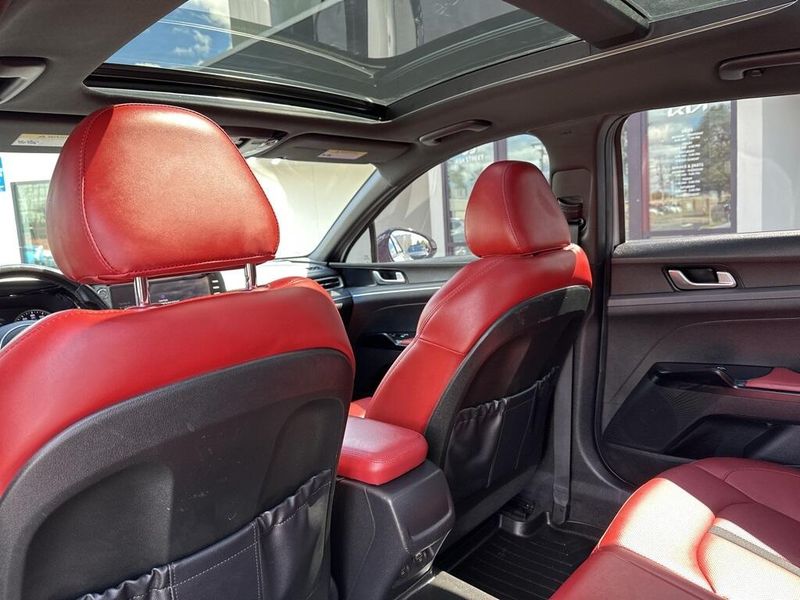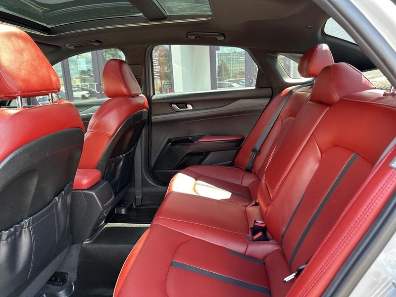 Additional equipment makes this K5 GT-Line stand out, with the GT-Line Premium Package offering Smart Cruise Control, Highway Driving Assist, and LED projection headlamps. The GT-Line Panoramic Sunroof Package enhances the open-air driving experience, while details such as carpeted floor mats, wheel locks, and premium finishes add convenience and style. This model also includes the gloss black pillar and door frame covers, further emphasizing its sporty and upscale design.