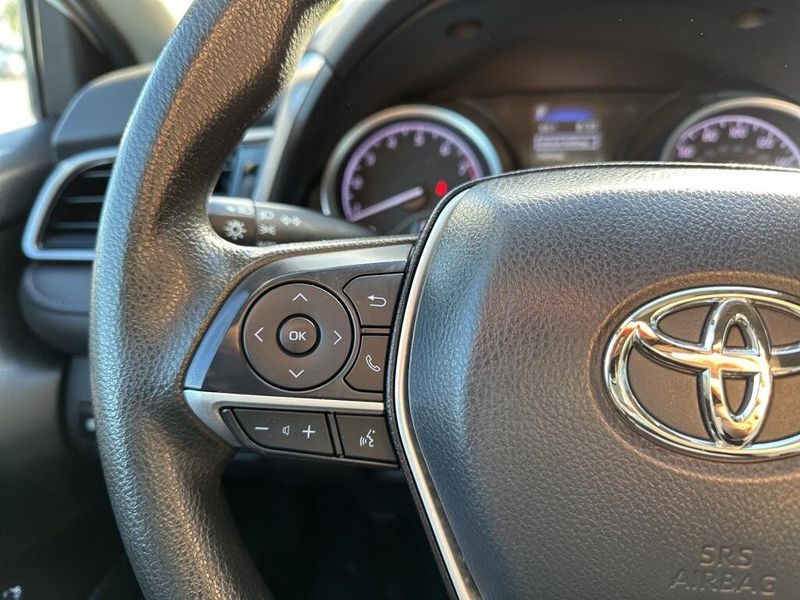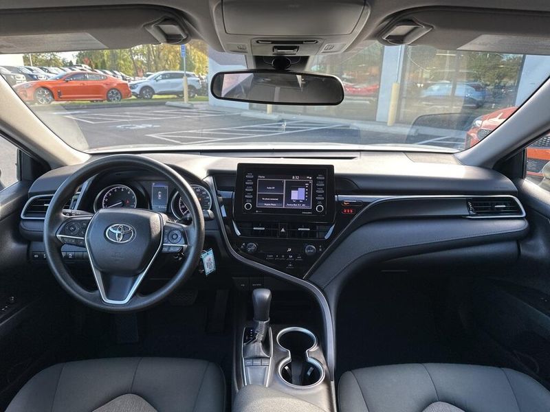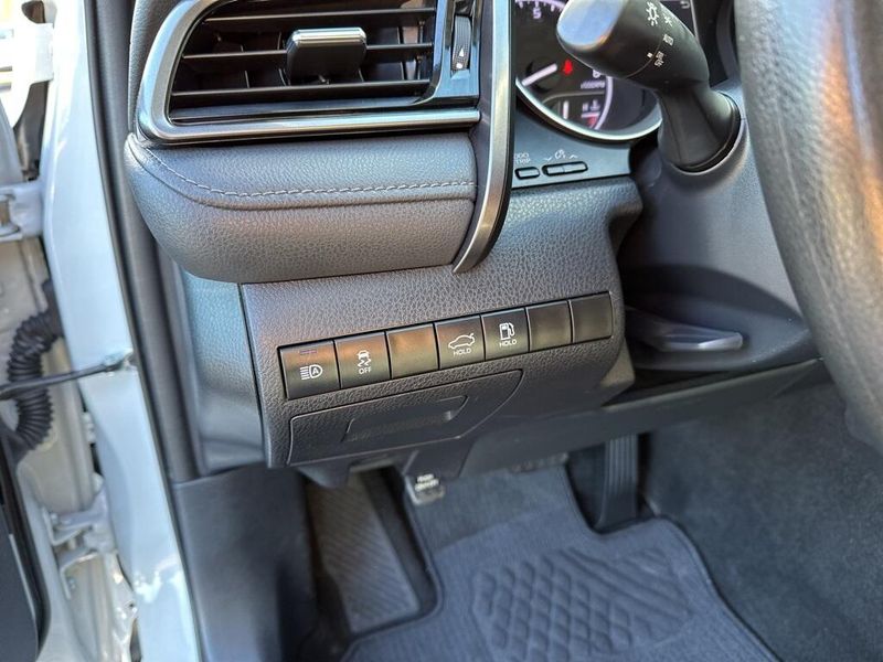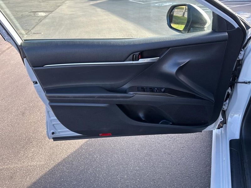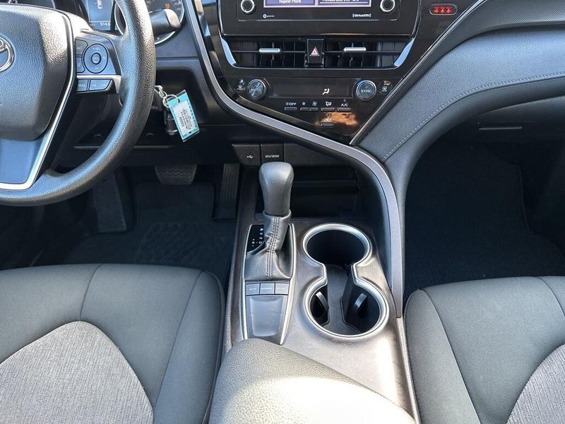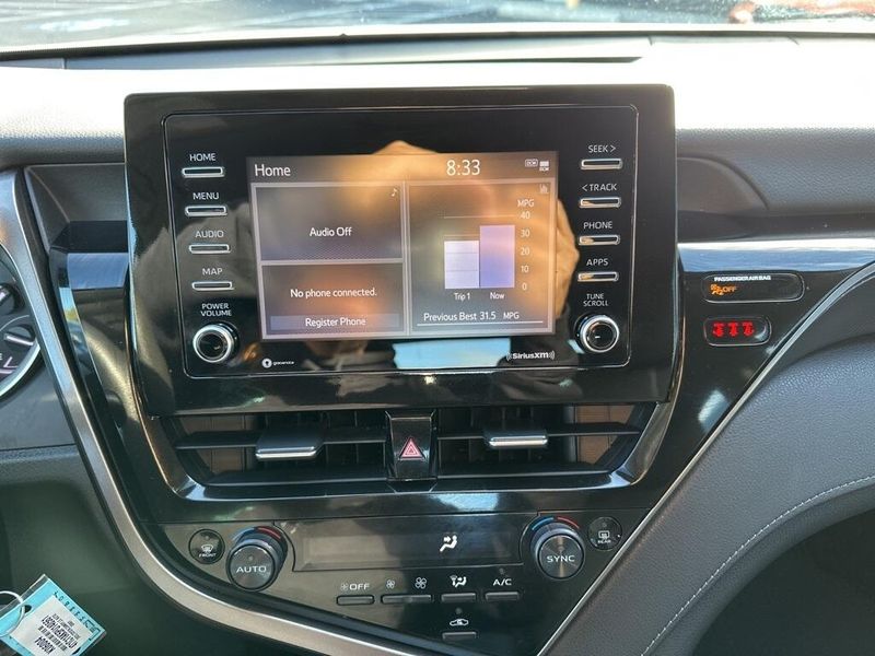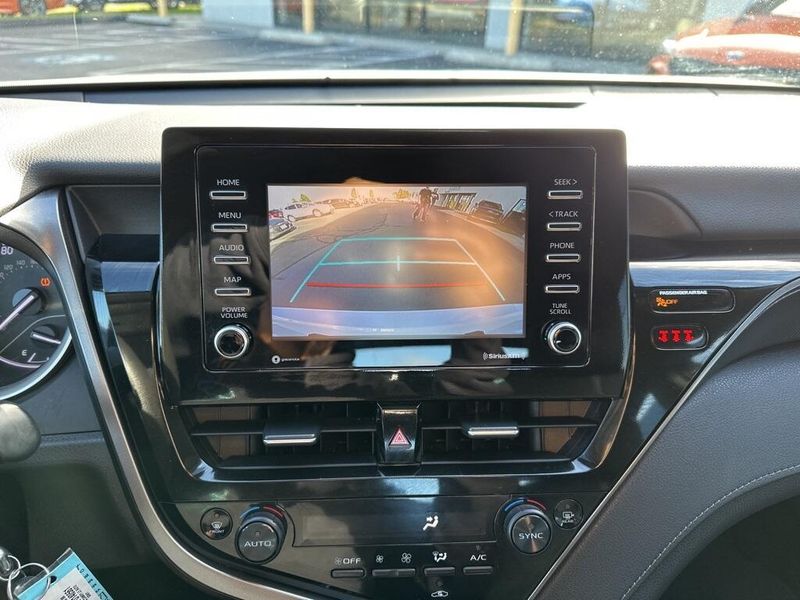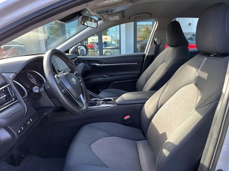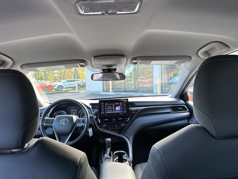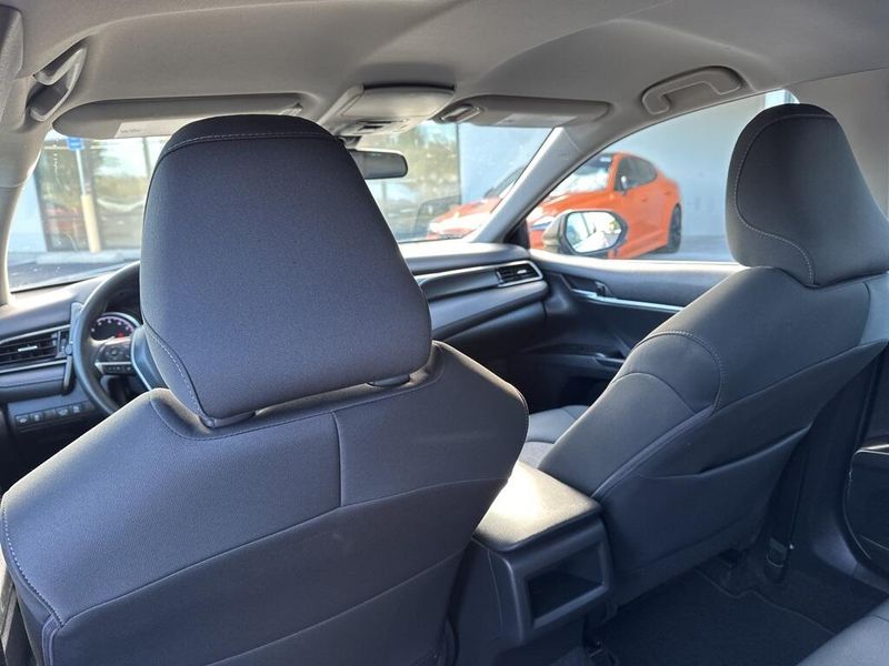 Inside, the Camry SE balances comfort and driver focus with upscale materials and intuitive technology. Cloth-trimmed sport seats with an 8-way power-adjustable drivers seat and power lumbar support deliver long-distance comfort, while the 6-way adjustable passenger seat ensures a customizable fit. Dual-zone automatic climate control, keyless entry, and push-button start make daily life simple. The infotainment system features a touchscreen interface with Bluetooth, Android Auto, Apple CarPlay, and voice-command capability, paired with a premium six-speaker sound system and two front LCD displays for crisp visuals. Smart touches such as illuminated glove box, cargo lighting, remote trunk and fuel-door release, and 60/40 split-fold rear seats make the cabin both inviting and versatile.