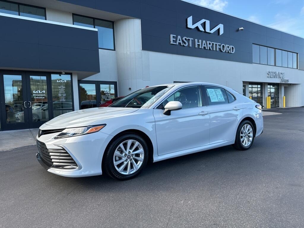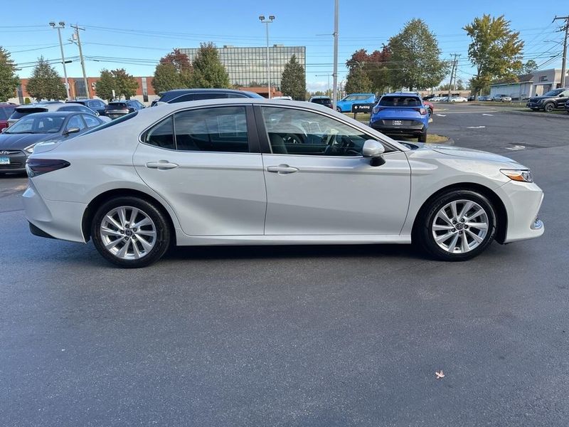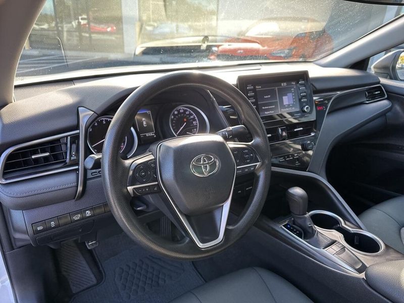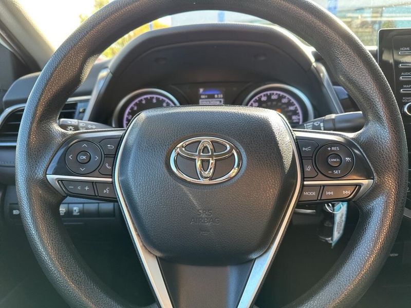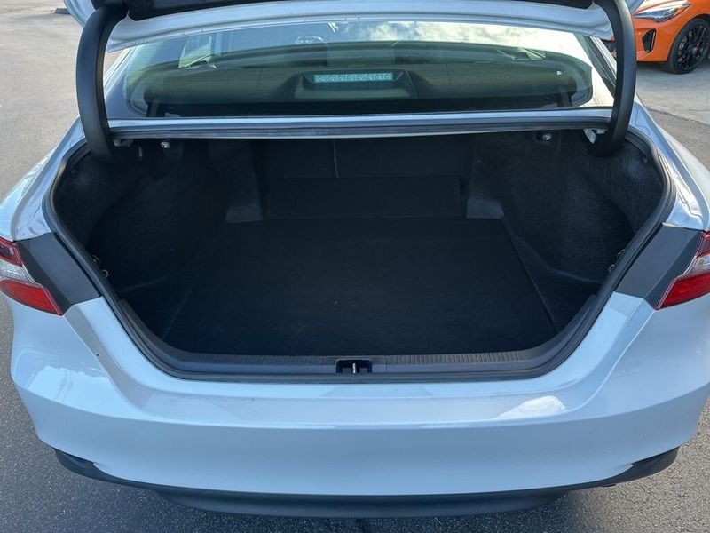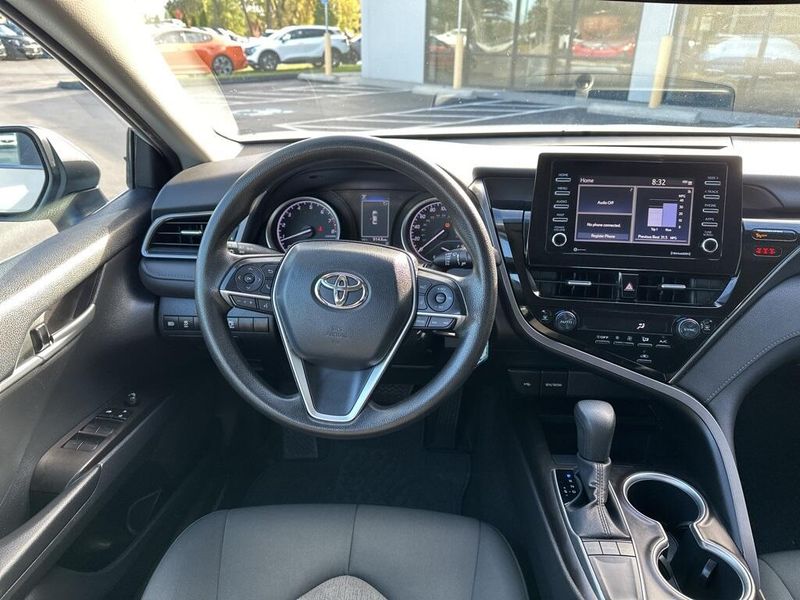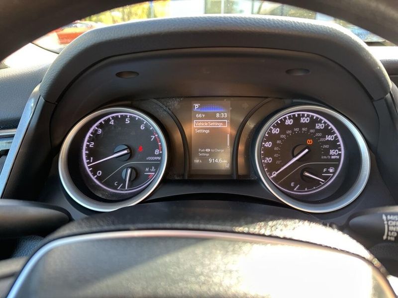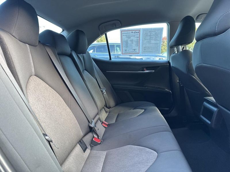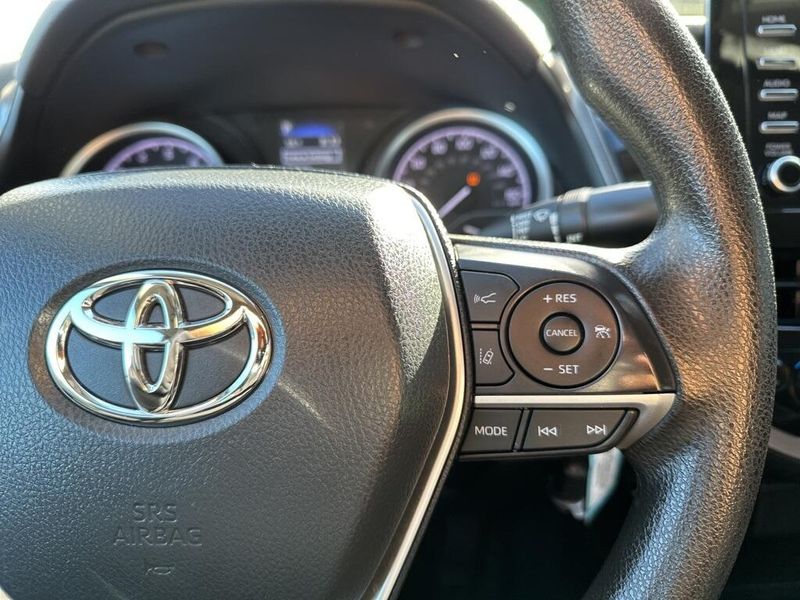 Inside, the Camry SE balances comfort and driver focus with upscale materials and intuitive technology. Cloth-trimmed sport seats with an 8-way power-adjustable drivers seat and power lumbar support deliver long-distance comfort, while the 6-way adjustable passenger seat ensures a customizable fit. Dual-zone automatic climate control, keyless entry, and push-button start make daily life simple. The infotainment system features a touchscreen interface with Bluetooth, Android Auto, Apple CarPlay, and voice-command capability, paired with a premium six-speaker sound system and two front LCD displays for crisp visuals. Smart touches such as illuminated glove box, cargo lighting, remote trunk and fuel-door release, and 60/40 split-fold rear seats make the cabin both inviting and versatile.