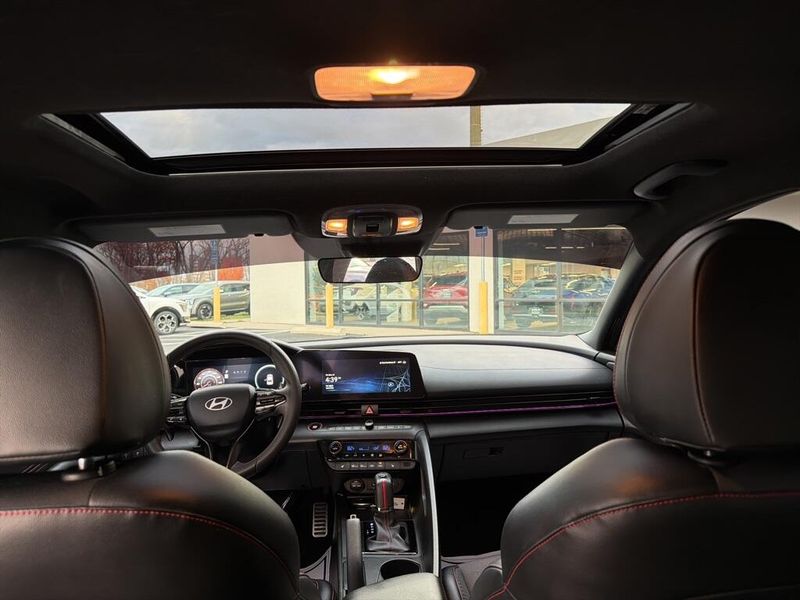 The 2024 Elantra N Line is powered by a 1.6-liter GDI turbocharged engine delivering 201 horsepower, paired with a 7-speed dual-clutch transmission featuring SHIFTRONIC paddle shifters. Drive Mode Select, a multi-link independent rear suspension, and precise steering contribute to agile handling and responsive performance. Safety features include Forward Collision-Avoidance Assist, Blind-Spot Collision Warning, Rear Cross-Traffic Collision-Avoidance Assist, Lane Keeping Assist, Lane Following Assist, Driver Attention Warning, Safe Exit Warning, multiple airbags, and a rearview camera. Inside, the cabin offers a 10.25-inch digital instrument cluster, N Line sport seats, dual automatic temperature control, power drivers seat with lumbar, heated front seats, Hyundai Digital Key, leather-wrapped sport steering wheel and shift knob, and 60/40 split rear seating. Technology highlights include a 10.25-inch navigation touchscreen with Apple CarPlay, Android Auto, Bluelink+ connected services, Bose premium audio, SiriusXM, wireless charging, and over-the-air updates. Exterior features include 18-inch alloy wheels, LED headlights, heated mirrors, high beam assist, and a power sunroof.